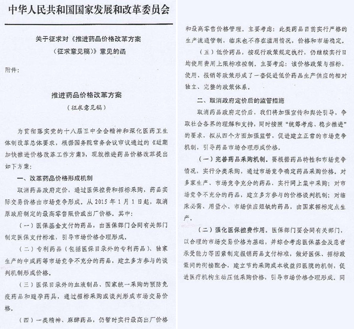 據(jù)悉2014年11月25日,國家發(fā)改委向8個(gè)行業(yè)協(xié)會下發(fā)了關(guān)于征求對《推進(jìn)藥品價(jià)格改革方案(征求意見稿)》意見的函。在此之前發(fā)改委藥品價(jià)改方案已經(jīng)多方意見征求,征求對象包括地方物價(jià)系統(tǒng)、衛(wèi)計(jì)委及人社部等相關(guān)政府部門。