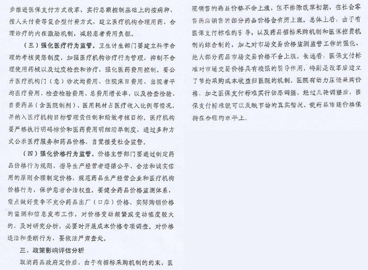 取消藥品政府定價(jià)后,由于有招標(biāo)采購機(jī)制約束,醫(yī)院銷售藥品價(jià)格不會上漲。但不排除改革初期,零售藥店銷售部分藥品價(jià)格會有所上漲。總體來看,由于有醫(yī)保支付標(biāo)準(zhǔn)引導(dǎo),以及招標(biāo)采購機(jī)制和醫(yī)??刭M(fèi)機(jī)制綜合制約(價(jià)格放開后未來主要價(jià)格管理應(yīng)由衛(wèi)計(jì)委和醫(yī)保部門負(fù)責(zé)),加之對市場交易價(jià)格監(jiān)測監(jiān)管強(qiáng)化(物價(jià)部門主要職責(zé)是加強(qiáng)市場監(jiān)管)。絕大部分藥品市場交易價(jià)格不會上漲。長遠(yuǎn)看醫(yī)保支付標(biāo)準(zhǔn)對市場交易價(jià)格有較強(qiáng)引導(dǎo)作用。特別是建立節(jié)約采購成本收益歸醫(yī)院機(jī)制,醫(yī)院有動(dòng)力壓低藥價(jià),加之醫(yī)保支付標(biāo)準(zhǔn)實(shí)時(shí)動(dòng)態(tài)調(diào)整,經(jīng)過幾輪(壓價(jià))調(diào)整后,醫(yī)保支付標(biāo)準(zhǔn)就可以反映市場真實(shí)情況。使藥品市場價(jià)格保持在合理水平上。