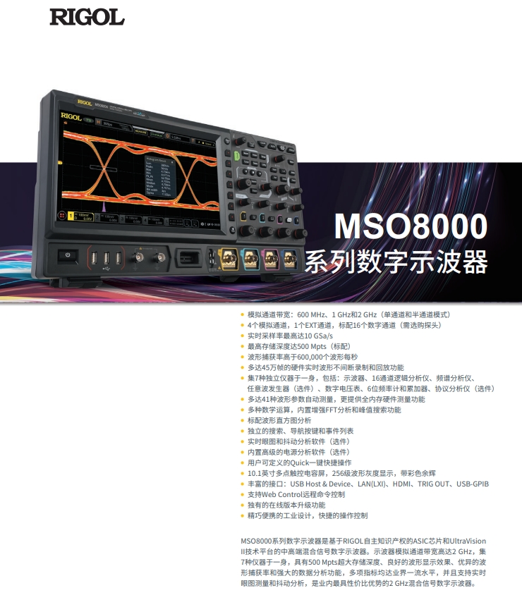 MSO8000系列數(shù)字示波器是基于RIGOL自主知識(shí)產(chǎn)權(quán)的ASIC芯片和UItraVisionII技術(shù)平臺(tái)的中高端混合信號(hào)數(shù)字示波器。MSO8000模擬通道帶寬高達(dá)2GHz,集7種儀器于一身,具有500Mpts超大存儲(chǔ)深度、良好的波形顯示效果、優(yōu)異的波形捕獲率和強(qiáng)大的數(shù)據(jù)分析功能,并且支持實(shí)時(shí)眼圖測(cè)量和抖動(dòng)分析,為客戶提供更優(yōu)的測(cè)試解決方案。