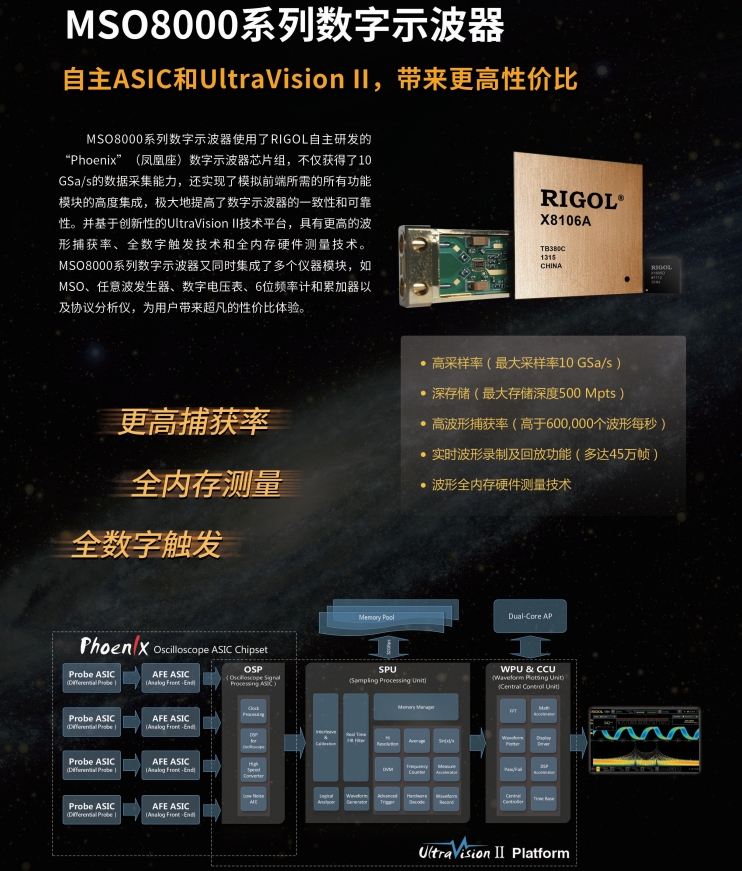 MSO8000系列數(shù)字示波器是基于RIGOL自主知識(shí)產(chǎn)權(quán)的ASIC芯片和UItraVisionII技術(shù)平臺(tái)的中高端混合信號(hào)數(shù)字示波器。